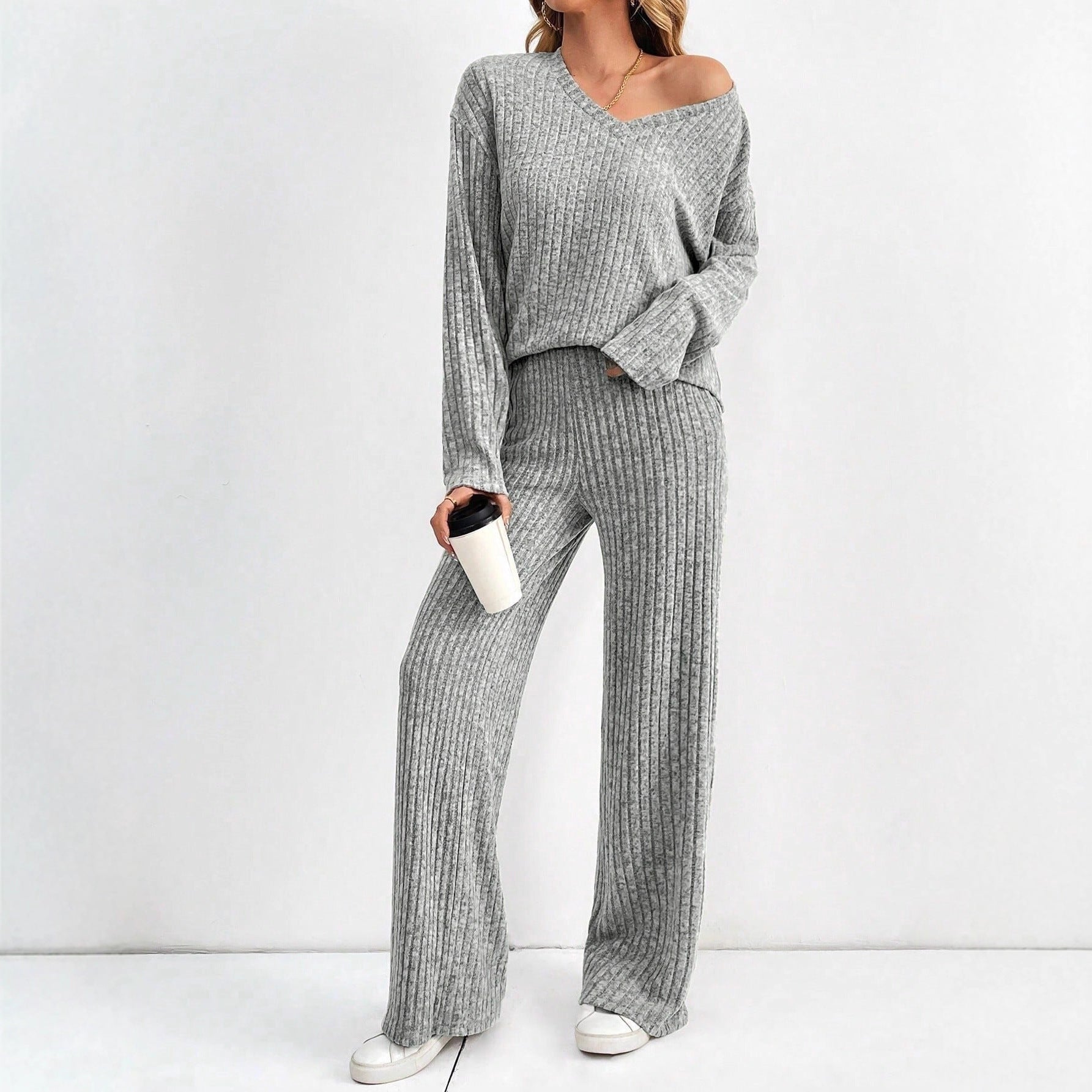 Ensemble côtelé décontracté deux pièces – Pull ample et pantalon fluide