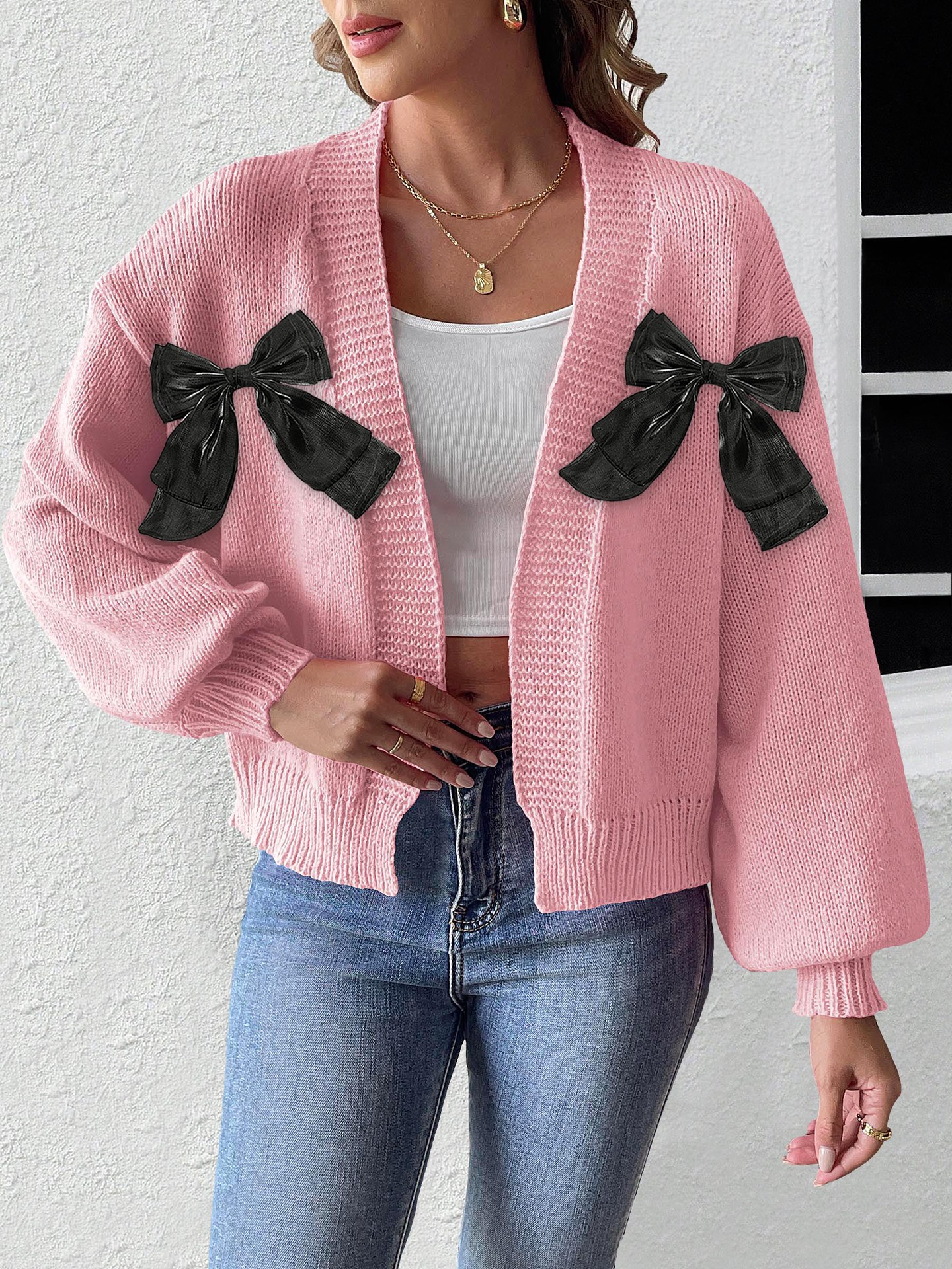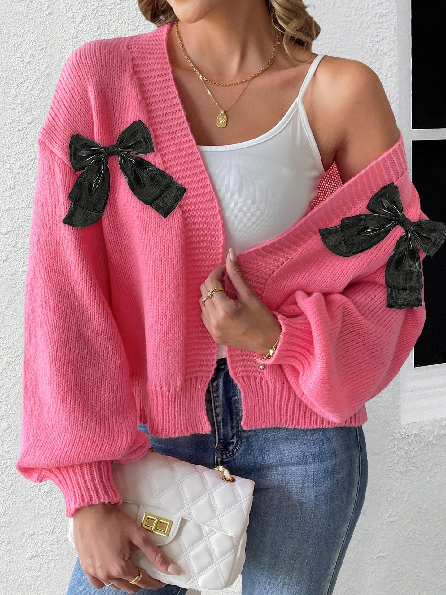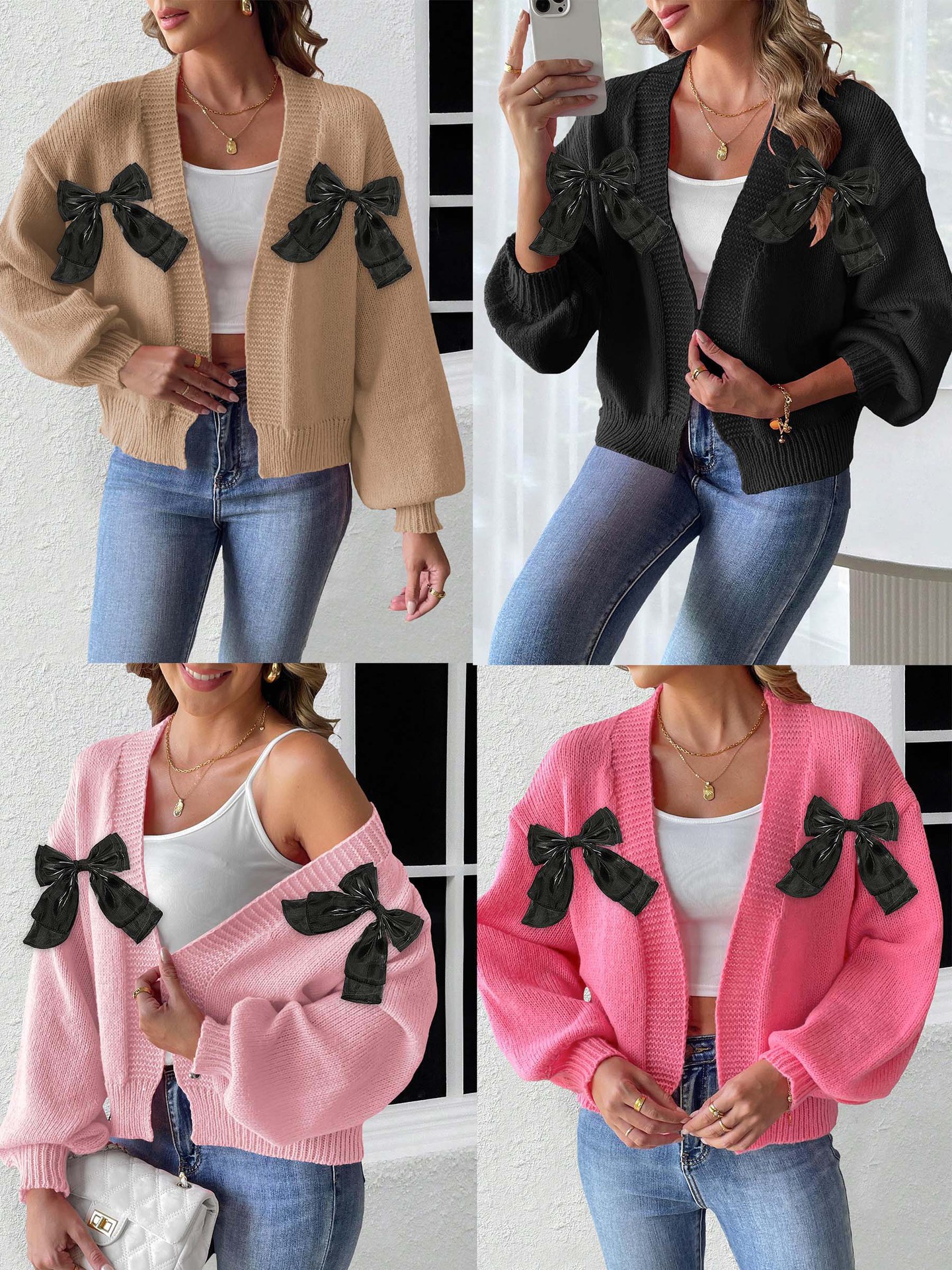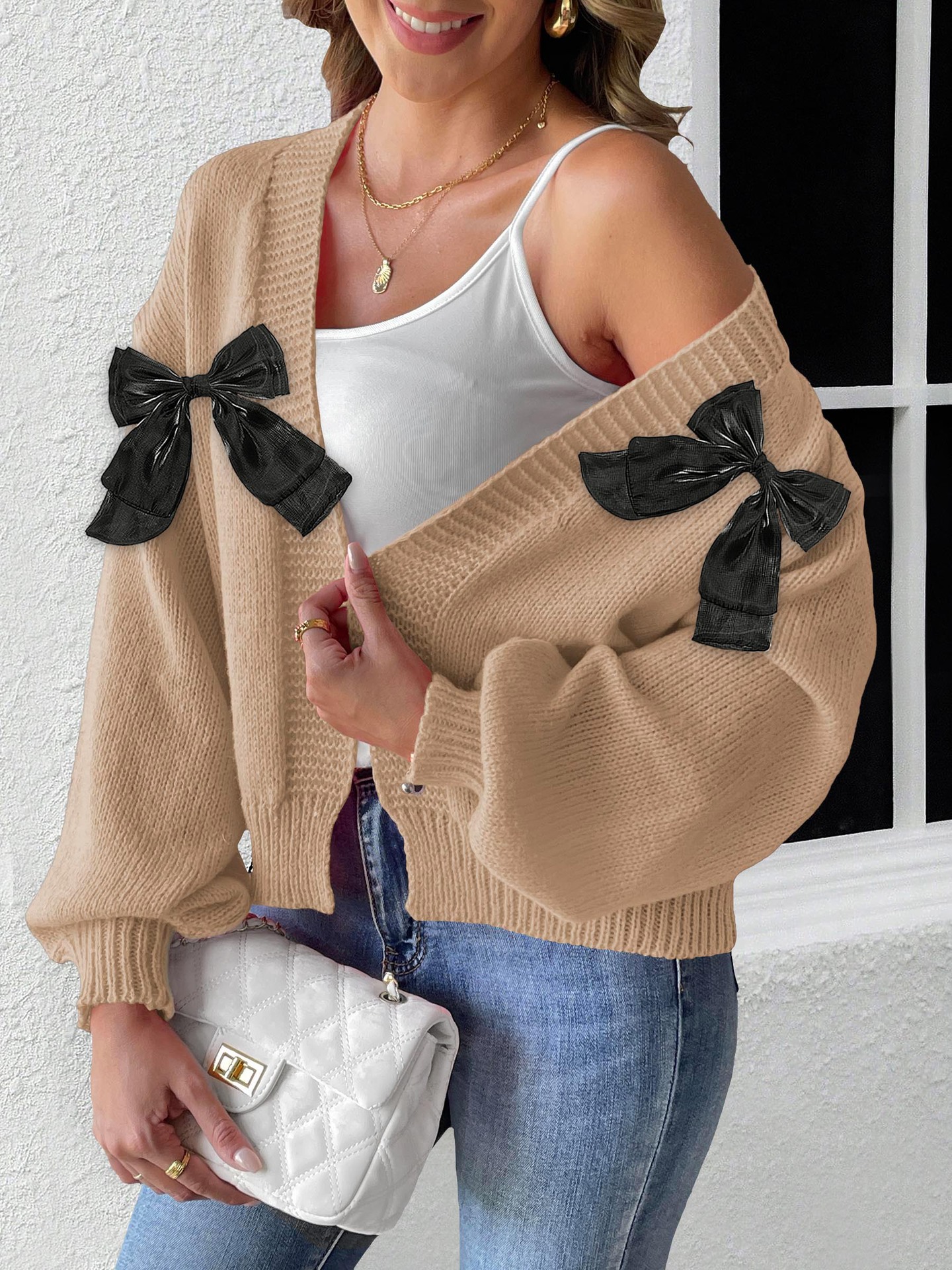 L’élément phare de ce modèle réside dans ses nœuds décoratifs placés sur la poitrine, apportant une touche originale et sophistiquée. Ces détails soignés font de ce cardigan une pièce unique, idéale pour celles qui aiment se démarquer avec subtilité.